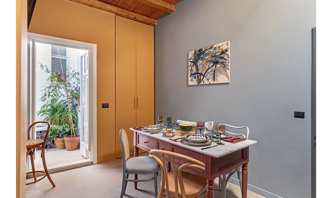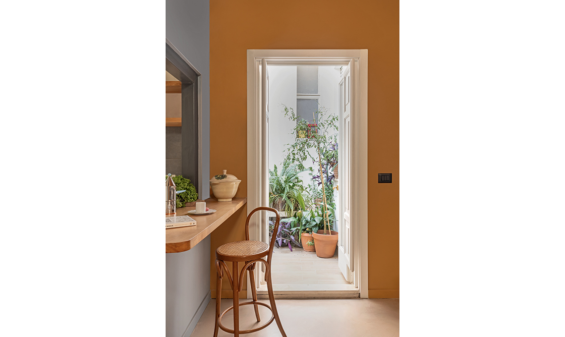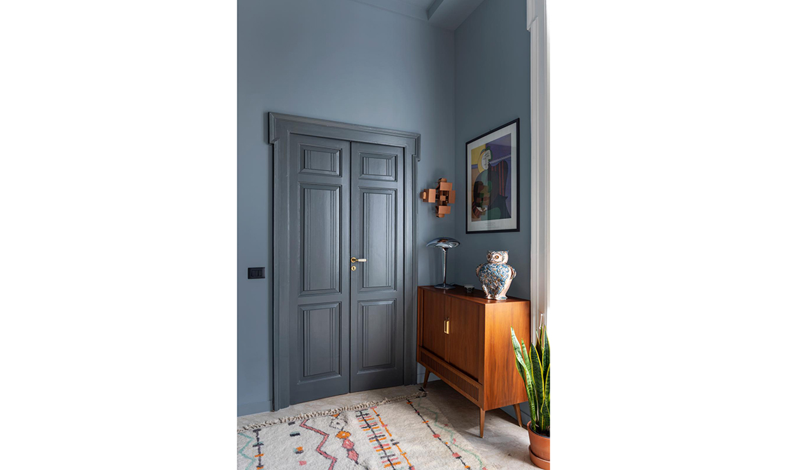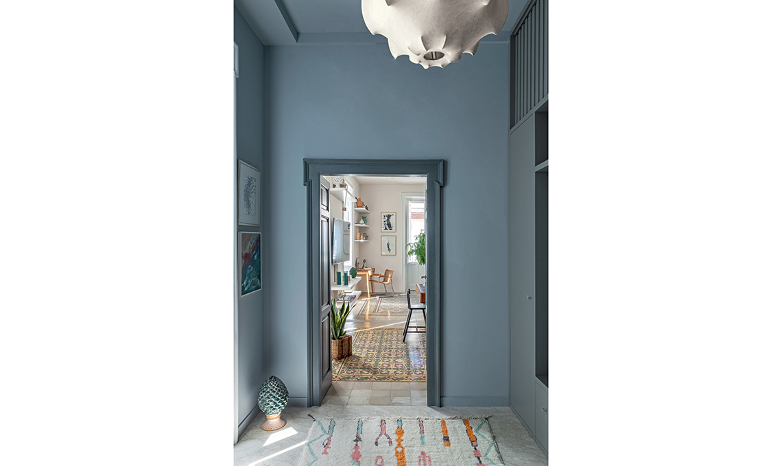 «I colori delle cementine in stile Liberty sono stati il ‘mastice’ decorativo che ha legato vecchio e nuovo: verdi in scala, azzurri, senape e grigi adesso li ritrovi in giro, a evidenziare la linea delle porte d’epoca e dei mobili su misura, e nella resina colata con un’unica gettata su cucina, tinello e bagno».
