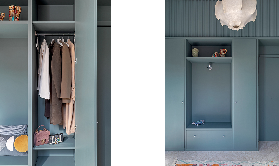 Armadio disegnato da Grazia Caruso di Atypique Design Studio e realizzato su misura da [Falegnameria Battiato Lorenzo], lampada [Jieldé], tappeto [Casa Amar], lampada Viscontea vintage [Flos]. Pitture: a parete, Scandi LightTM, sul mobile colore Elementary, My Dear WatsonTM, entrambe di [The Paint Makers Co.].