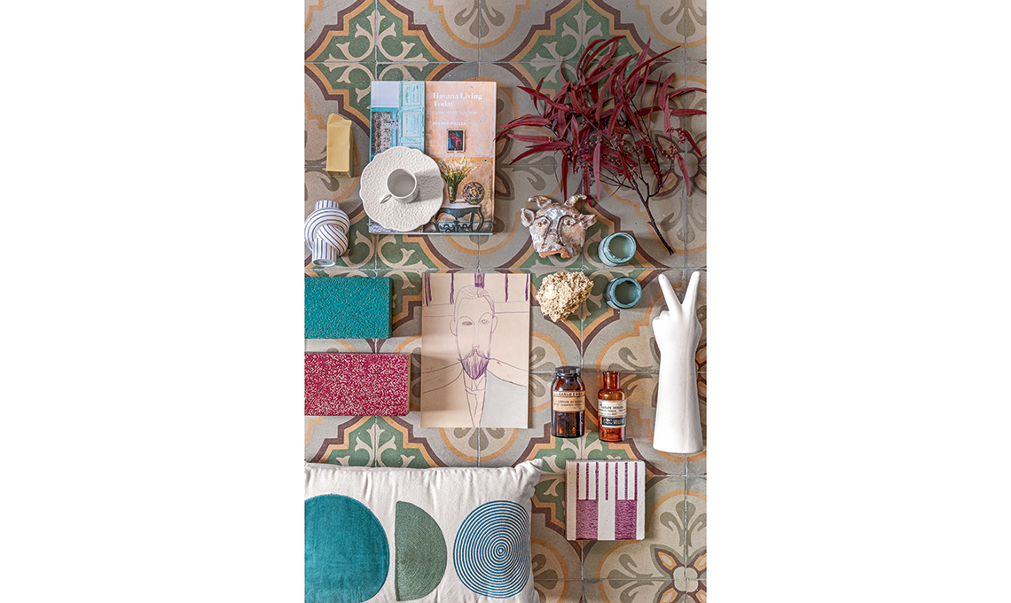 Vaso mano [Rituali Domestici], vasi miniatura [Rosenthal], tazzina [Alessi], tutto [da Russo&DiMauro]. Vasi Not Ordinary Brick in verde e rosso [Federica Bubani], cuscino Nazca [Fazzini], piastrella decorata a mano [Ninefifty], maschera in ceramica di animale [Ceramiche Artistiche Navanzino], colori [The Paint Makers Co.].