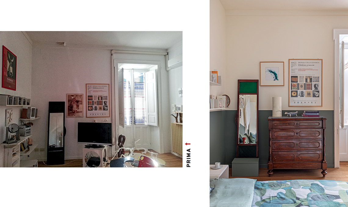 Il comò che prima stazionava nella camera da pranzo, in camera da letto trova una nuova ricollocazione: la sua altezza è stata il punto su cui regolare quella della boiserie dipinta alle spalle, così che otticamente potesse raccordare tutti gli elementi della stanza, inquadrando persino il letto alla francese che la proprietaria ha mantenuto senza testiera. Il punto di verde si ricollega a quello del mobile all’ingresso!