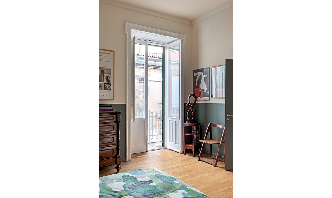 Per quel che riguarda il décor, il focus di partenza sono stati i due scenografici pavimenti in stile Liberty che hanno suggerito i colori e i nuovi materiali, come la resina e le piastrelle verde bottiglia del bagno. Intorno, i quadri d’autore e i pezzi d’artigianato collezionati da Francesca ritornano a splendere.