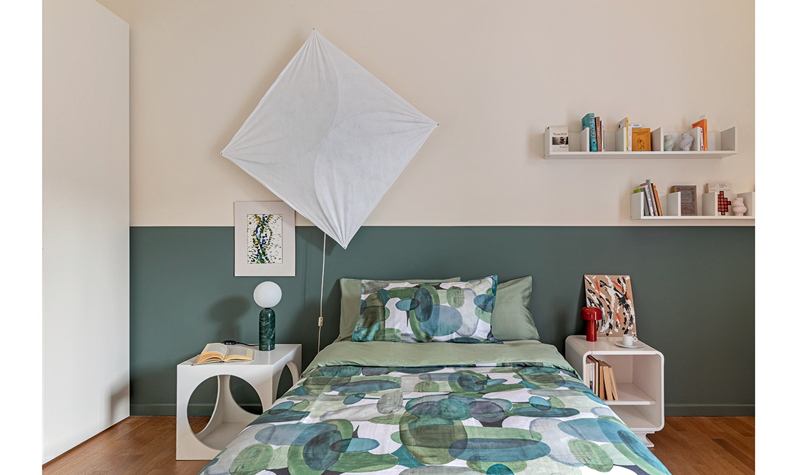 Parure letto Bling [Fazzini], piumino e guanciali Perla [Cinelli Piume e Piumini]. Lampada in marmo verde Guatemala Emma Ta [Contardi da Russo&DiMauro], lampada rossa Bellhop [Flos]. Sul comò, vaso Coi baffi bianco [Crita Ceramiche]. Colori alle pareti Elementary, My Dear WatsonTM e Ursula’s BikiniTM [The Paint Makers Co.].