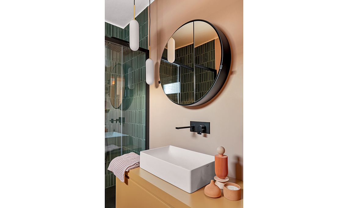 A parete e a pavimenti, resina [Kerakoll], specchio Round Box [Ceramica Cielo], lampade Atil [Aromas del Campo]. Mobile bagno Hito color senape [Arblu], rubinetteria Via Manzoni [Gessi], box doccia Sirio [Arblu], sanitari Tesi [Ideal Standard], tutto da Lady Ceramica. Candela Cabana Candle – Vanilla e diffusore fragranze terracotta Feel [Federica Bubani]. Sul mobile, set di asciugamani Nettare [Fazzini].
