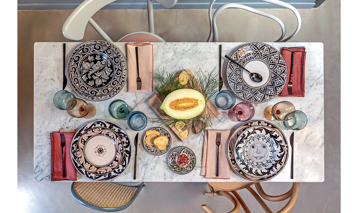 [Ninefifty], vasetto Kuri Yo [Federica Bubani], vasetti in miniatura [Rosenthal da Russo&DiMauro], piante [Alfò Fiori], piatto Tema&Variazioni [Fornasetti].