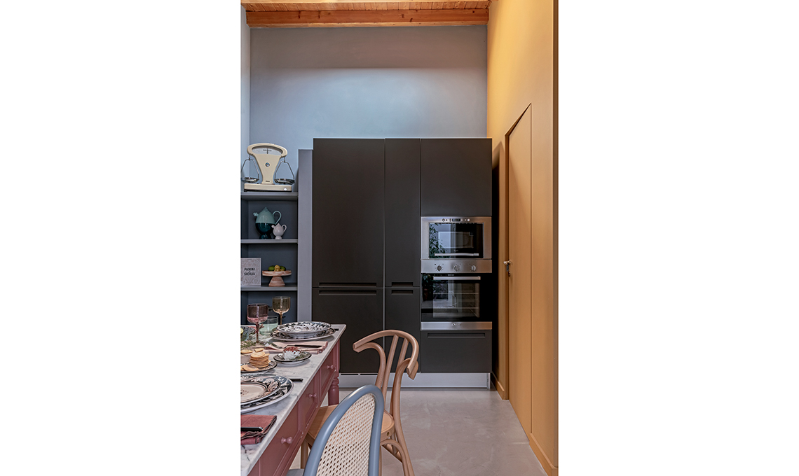 una grande dispensa, dipinta con uno smalto accordato al senape speziato delle pareti. Armadio dispensa disegnato dall’architetta Sandra Saviotto dello studio Work in Progress e realizzato da [Falegnameria Lorenzo Battiato]. Quadro Salvatore Zimone.