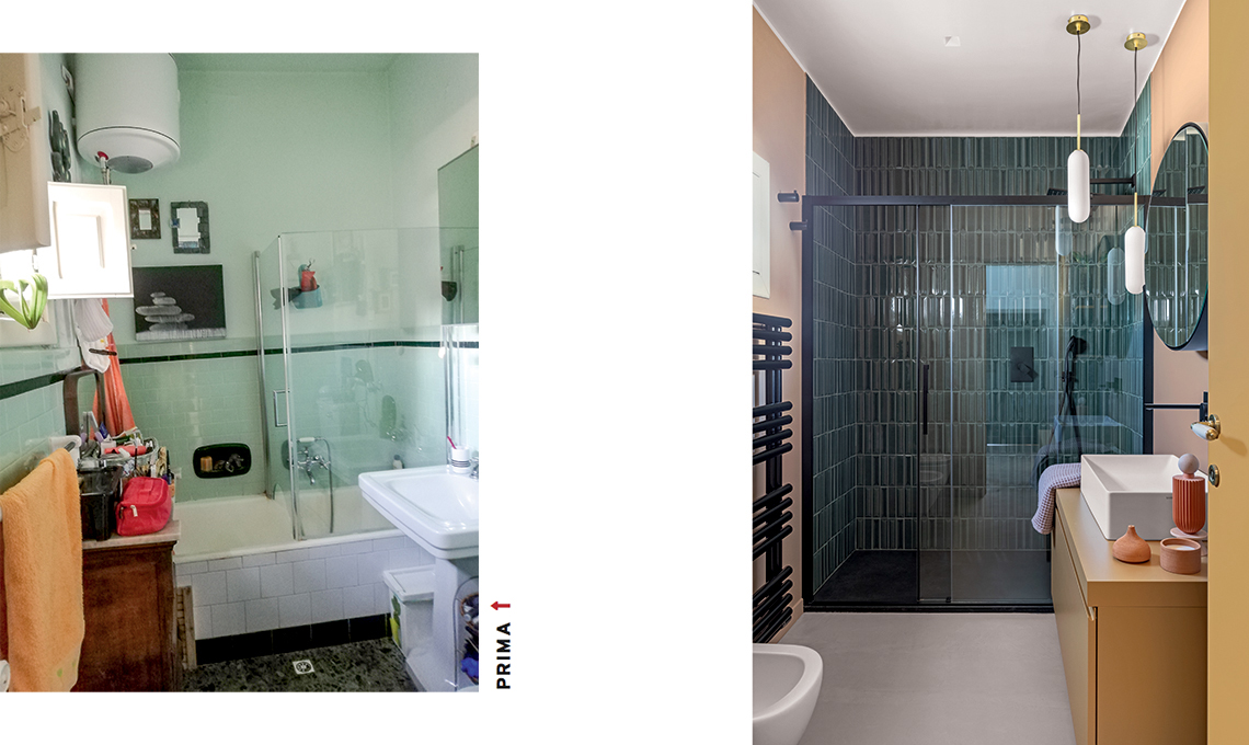 Il vecchio bagno pativa l’assenza di una grande doccia e di mobili contenitivi che non trovavano spazio per via del lavabo a colonna. Ora anche lo specchio ha un vano in più, assai utile per creme &Co.! Nel box doccia piastrelle Flauti [Ceramica Vogue].