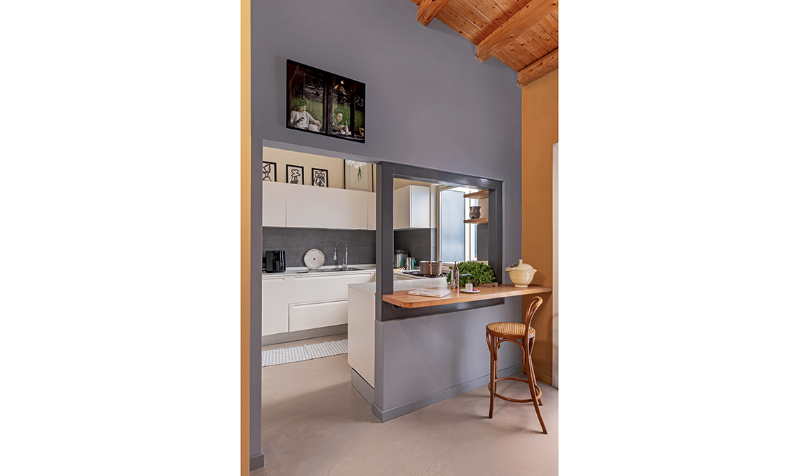 Il vano passavivande tra cucina e tinello acquista solidità con un telaio metallico su cui è stato fissato il banco snack. Caffettiera La Conica [Alessi da Russo&DiMauro], pentola Century [Pintinox], piatto con ciliegina Minnuzza di Sant’Agata [Folk Magda Masano]. Resina [Kerakoll]. colori a parete Scandi LightTM e Ambrosia GoldTM.