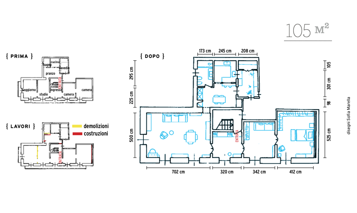 Francesca voleva anzitutto un ampio salotto, un nuovo bagno e un ingresso pratico: eliminata la suddivisione tra sala da pranzo e salotto, lo spazio è raddoppiato, quindi sono stati ridistribuiti i mobili potenziando gli spazi morti con pezzi disegnati su misura, polifunzionali.