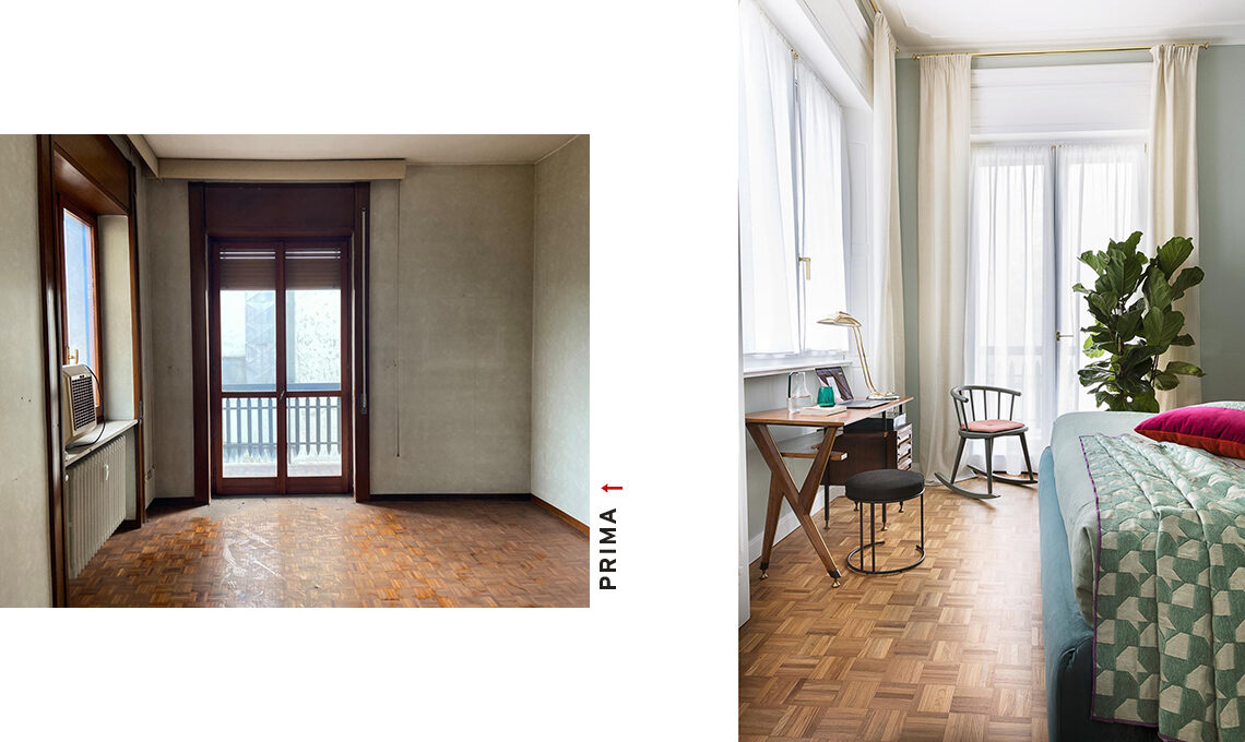 Tra le finestre, credenza vintage Anni ’50 di Vittorio Dessi [Carrozzeria900] con vasi nero Kali [Tognana € 57,20], in vetro con manici colorati e caraffa fumé [Coincasa €29,90 e €12,90]. Piante e cachepot [Viridea].