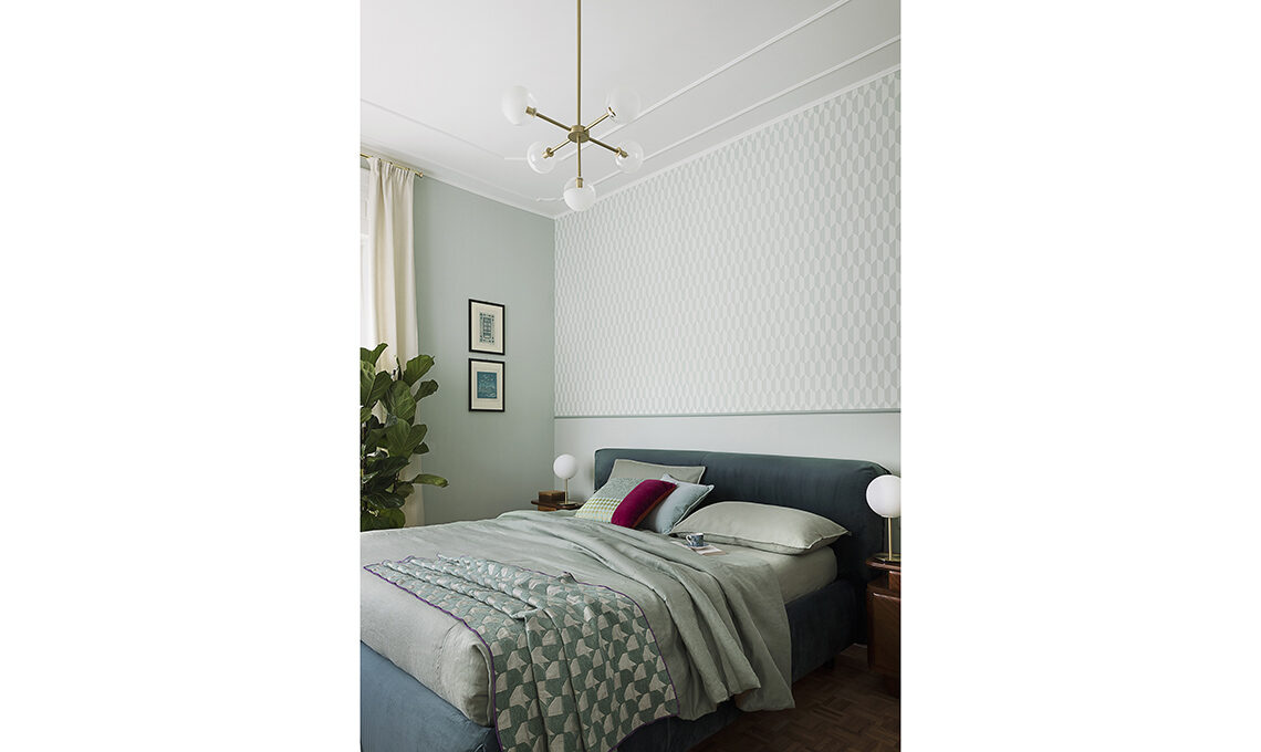 Letto Allan con contenitore Folding Box [Noctis, cm 213,5x236x105h € 2.340]. Cuscini Carrè T multicolor [cm 43x43 € 126] e Carrè in velluto [cm 43x43 € 119] tutto [L'Opificio]. Sui comodini vintage, lampade TR Bulb [Menu € 370 cad]. Tappezzeria Petite Tile Duck Egg [Cole & Son distr. da B&B Distribuzione] e sospensione Molecola 275.09 [Il Fanale].