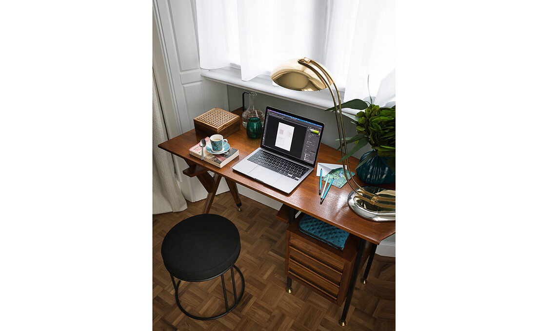 Sulla scrivania vintage [Vecchio Mio], scatola, caraffa e bicchiere [Coincasa], tazzina Jungle [Easy Life] e cucchiaino Zest [KnIndustrie], sgabello Nina [Living Divani, ø cm 37x39h da € 750]. pianta [Viridea].