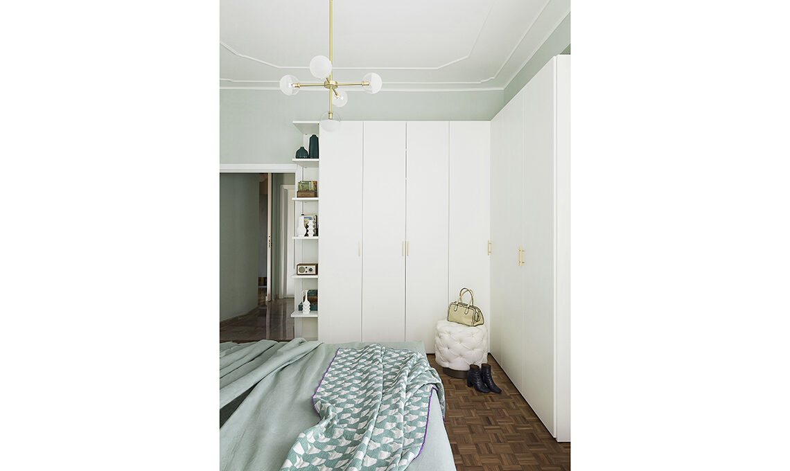 Armadio angolare in frassino bianco [Moretti Compact], sulle mensole vasi ottanio [QVC], radio Model One BT [Tivoli Audio € 199] e set di vasi Matt White Porcelain [HKliving]; pouf George capitonné [Cantori].