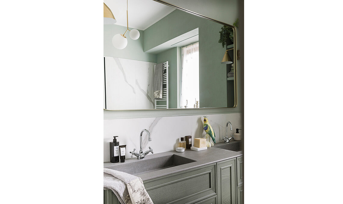 Sul mobile Opera in frassino rosmarino con top a due lavabi integrati in Laminam Savoia Grigia [Arcom], saponi e prodotti skincare [Womo]. Specchio in metallo dorato Matthew [Maisons du Monde, cm 165x102 € 199], asciugamani Bauhaus Stone Salvia e Stone Toile de Jouy [Borgo delle Tovaglie, da cm 40x60 da € 24 cad]. Appliques Game e sospensione Twice in ottone [House Doctor], statuetta Pappagallo in ceramica [Les Ottomans]. Sulla finestra, set di vasi [HKliving].