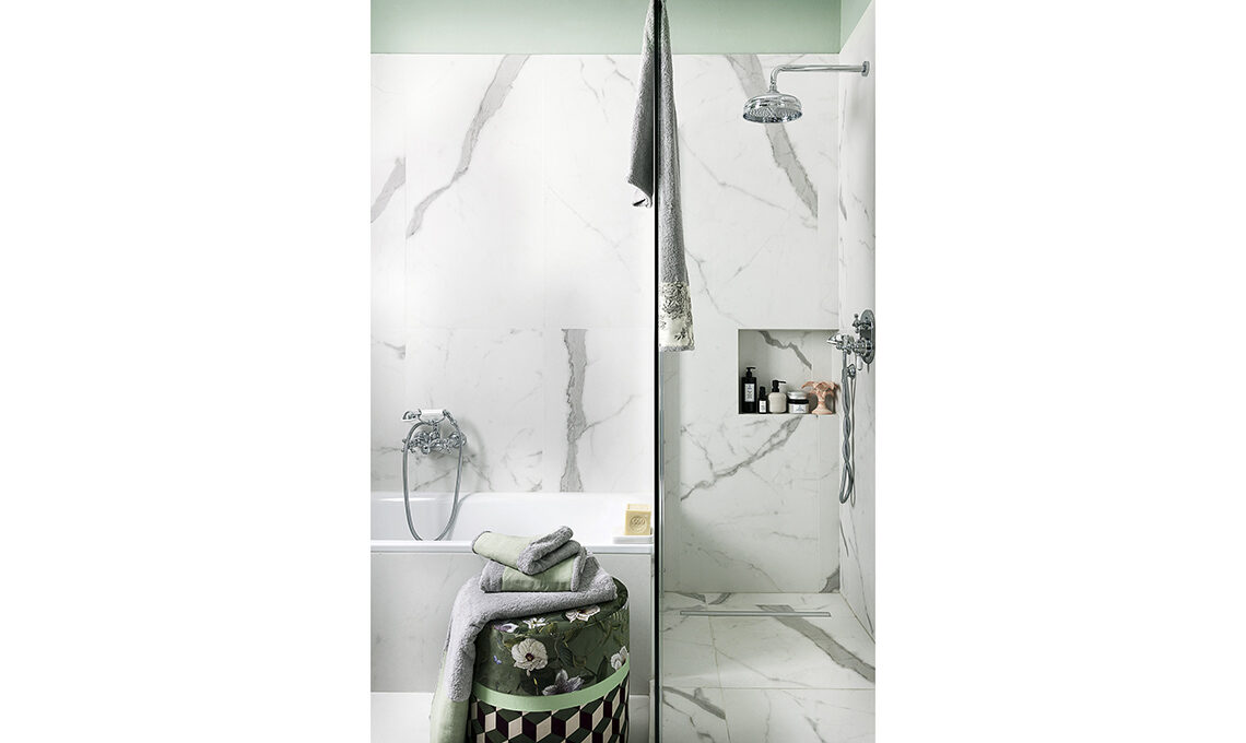 A parete e pavimento, piastrelle Eternity in grès effetto marmo Statuario [Panaria], smalto opaco codice colore L0.04.65 [Sikkens].