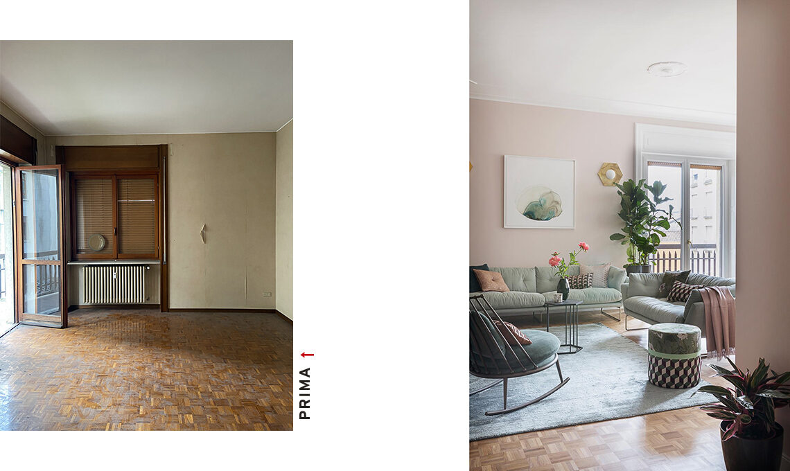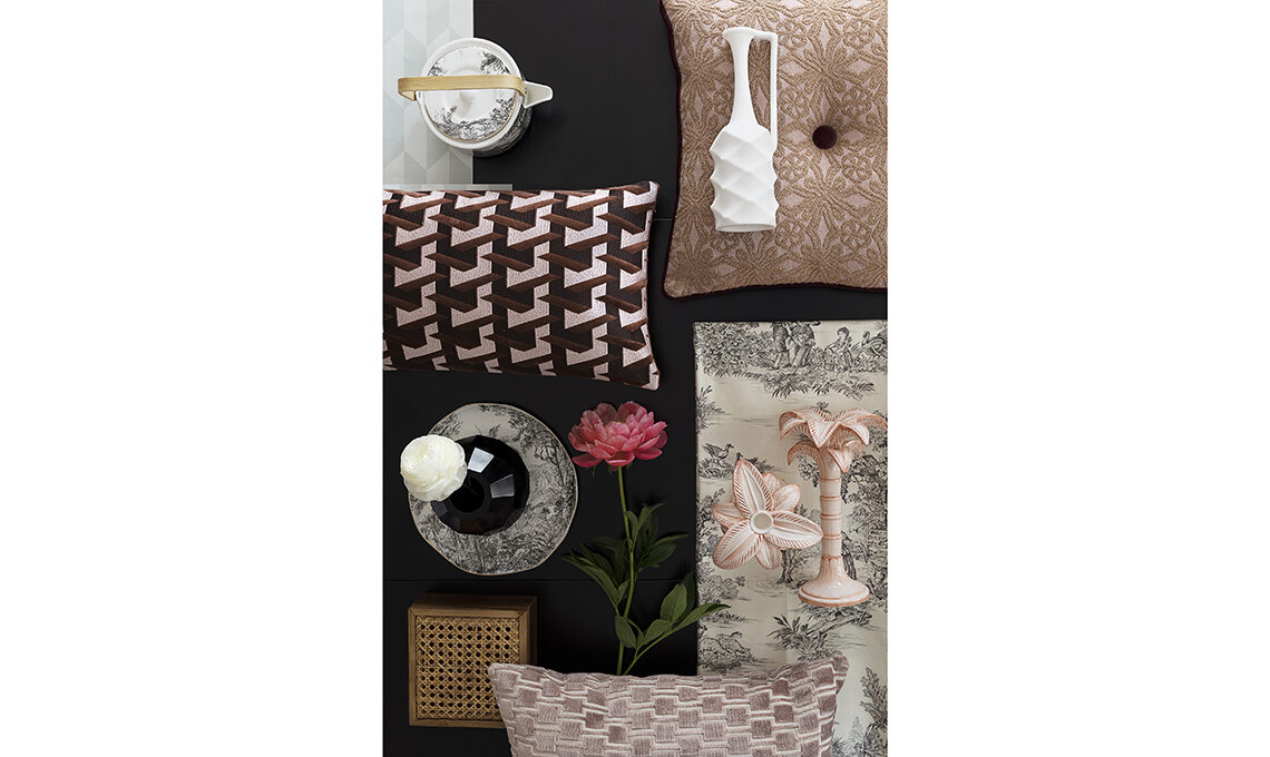 € 100]. Sedia vintage [da Vecchio Mio] rivestita in tessuto Opie Blush [Romo Fabrics € 110/m], armadio Retro Webbing Cabinet [HK living].