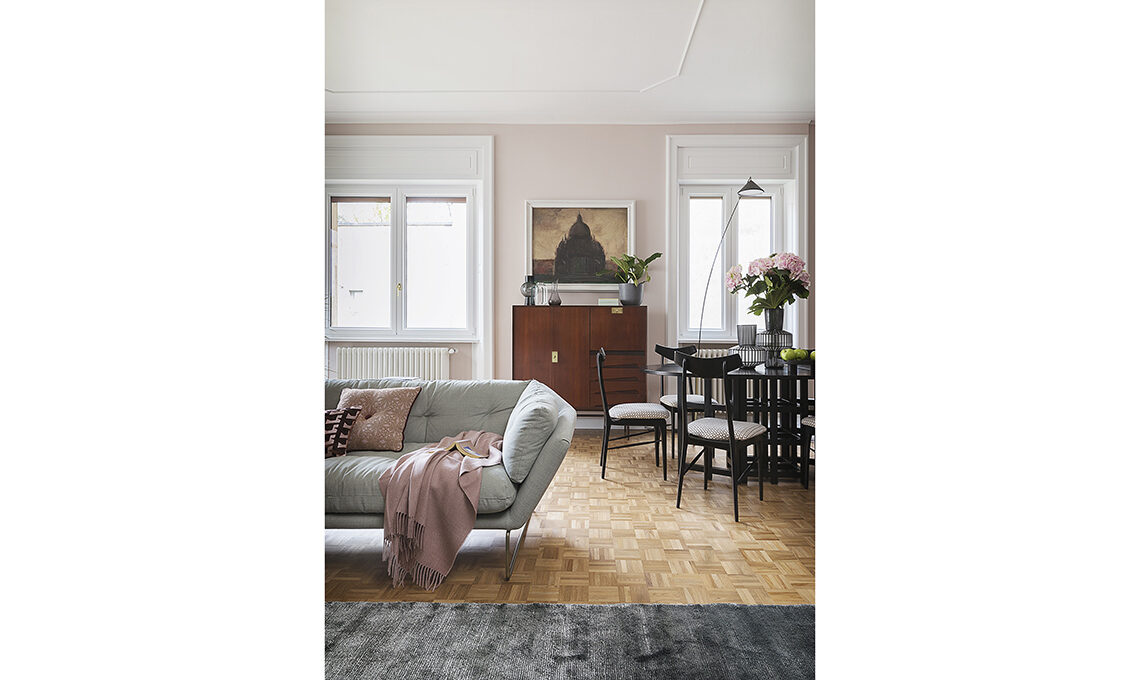 Tavolo ovale allungabile vintage Mackintosh, fuori produzione [Cassina] con sedie vintage [da Vecchio Mio] rivestite con tessuto Opie nel colore Blush [Romo Fabrics € 110/m]; piantana regolabile Flex Floor [Seyvaa].