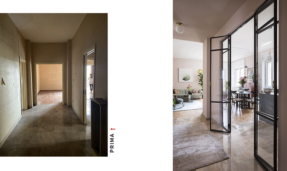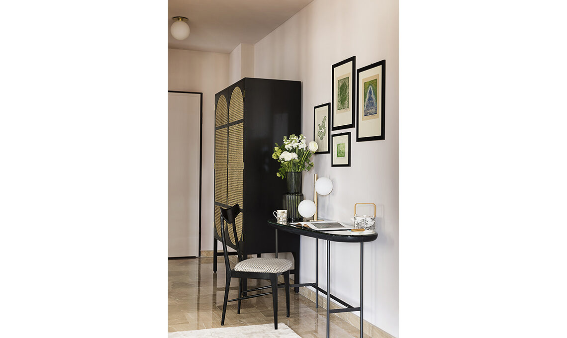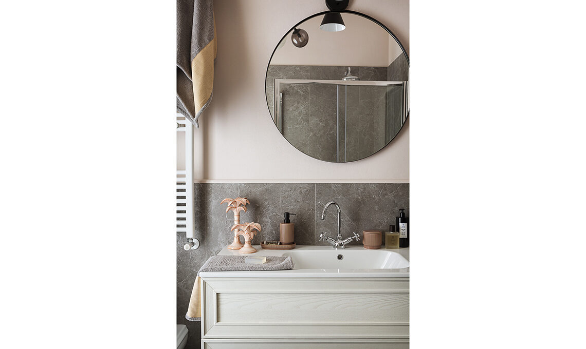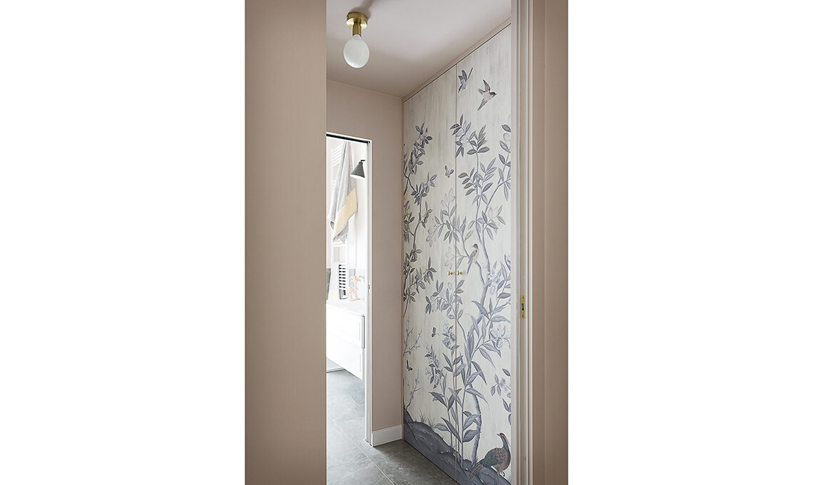 Nell’antibagno, idropittura codice colore D6.03.77 [Sikkens]; a terra, piastrelle Trilogy Sand Grey Soft [Panaria]; sull’armadio, tappezzeria Chinoiserie Chic Pearl Gray [Rebel Walls]; plafoniera in ottone [Etsy].