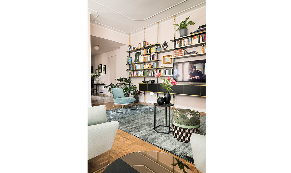 Libreria Puntello in metallo e ottone [Officina84]. Tappeto Suite SE332 Aqua [Carpet Edition, cm 200x300 € 2.049,60], pouf Mini Salvia [Nap Atelier, ø cm 43x 44h € 270], poltrona a dondolo Aurora [Cantori].