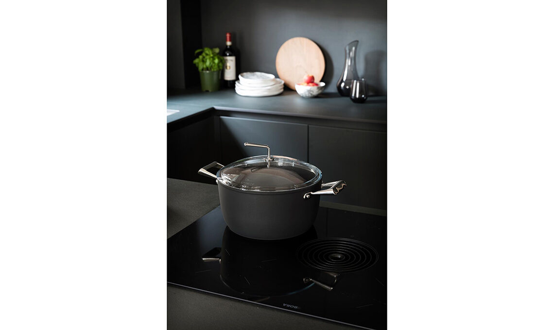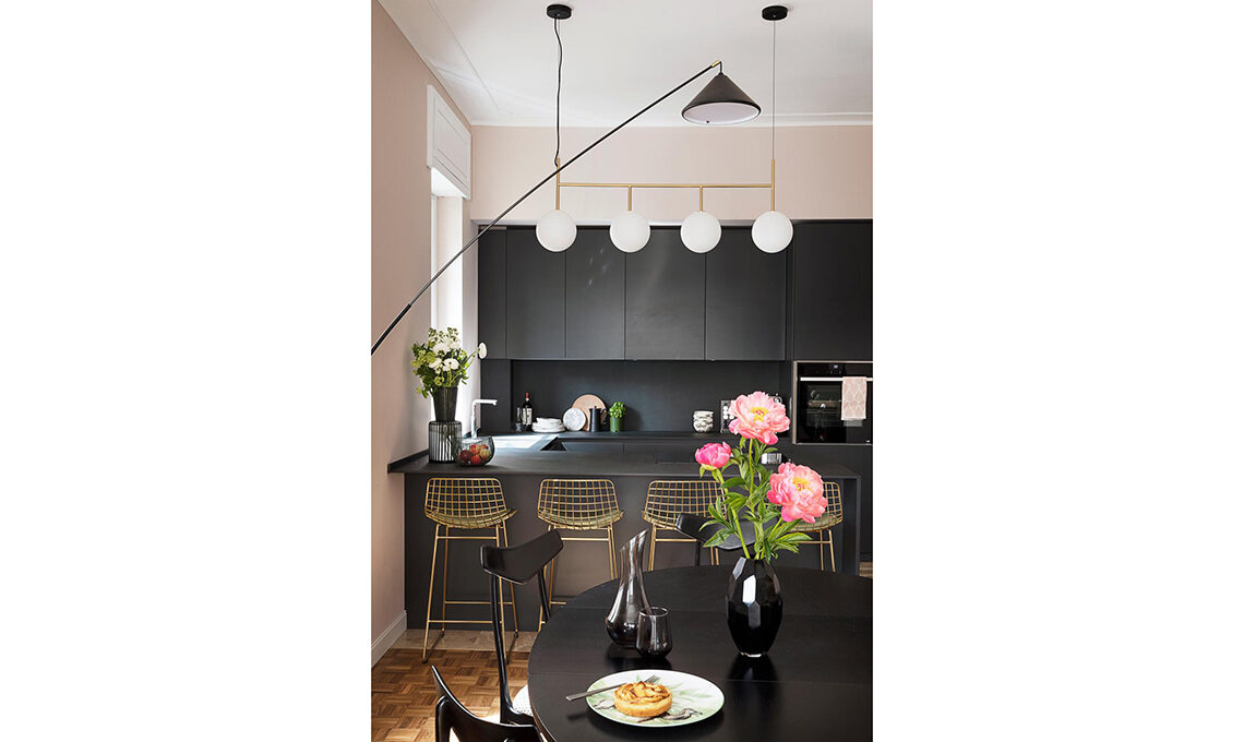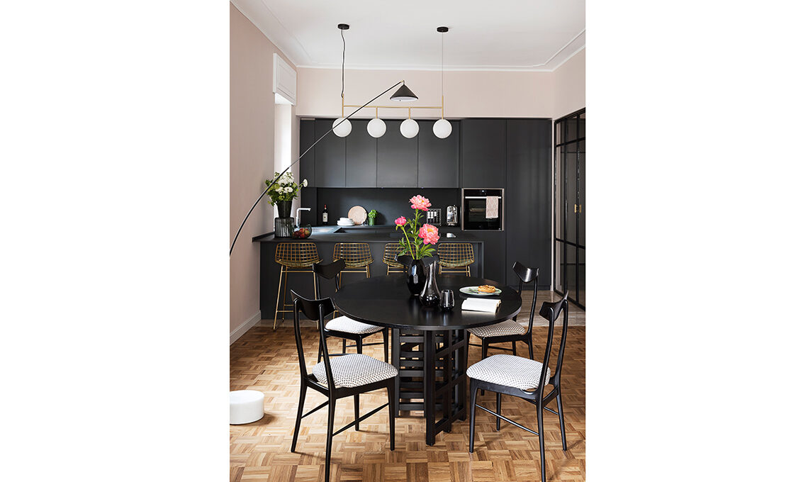Cucina Bluna in laccato antracite con top e schienale in grès [Binova]; sulla penisola, centrotavola [Antonino Sciortino] e vaso [da Nap Atelier € 100]. Sul tavolo, vasi [EDG Enzo De Gasperi] più bicchiere e caraffa [Coincasa], sgabelli Wire Bar Stool [HKliving]. Sospensione TR Bulb Suspension Frame [Menu € 999,95].
