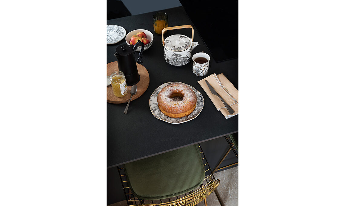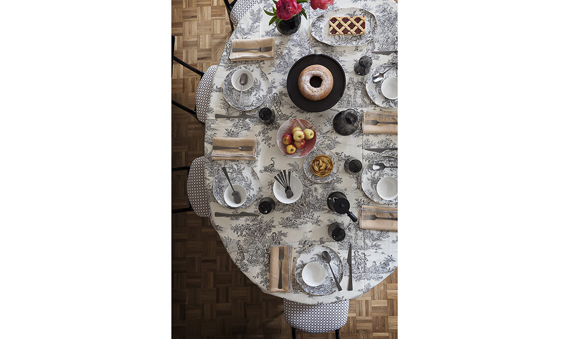 Il tavolo è apparecchiato con tovaglia Riviera in lino [cm 170x310 € 430] e tovaglioli Lino Filo [cm 45x45 € 12] di [Borgo delle Tovaglie], posate Zest e moka [KnIndustrie], piatti, piattini, ciotole e portata [Easy Life], bicchieri e brocca [Coincasa] e ciotola [Les Ottomans ø cm 22 € 36].