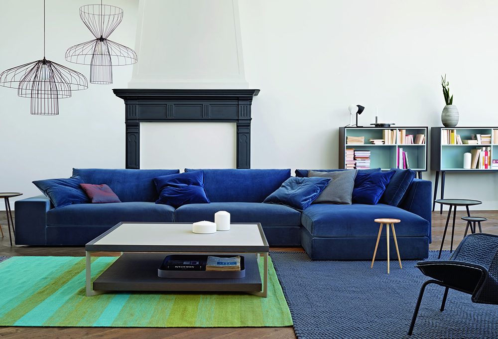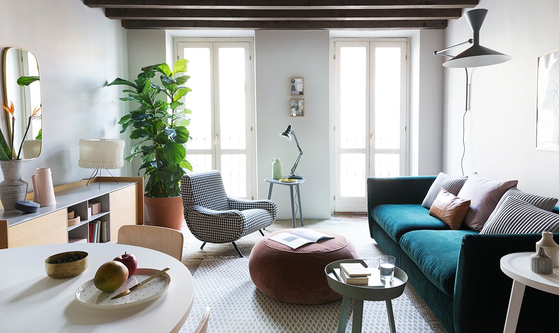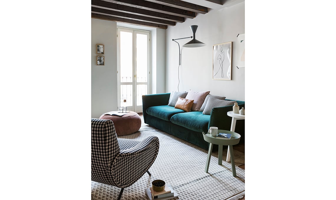 Il sofà Leaf in velluto [Calligaris, cm 242x102x87h €3.713] è abbinato al pouf Geo [Saba Italia da €444,10] e alla poltrona Lady Iconica [Cassina, da €2.685]; cuscini [Nomess e Aytm], tavolini tondo [Muuto] e triangolare [Gervasoni], lampade Plissè [da Arcarreda] e da parete Lampe de Marseille [Nemo Lighting].