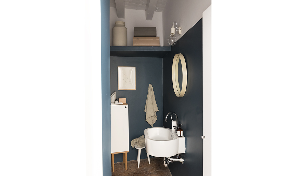 Il bagno è tutto giocato tra bianco, blu e tocchi di rosa. Nella parte bassa