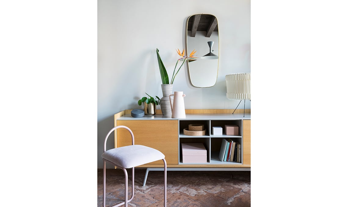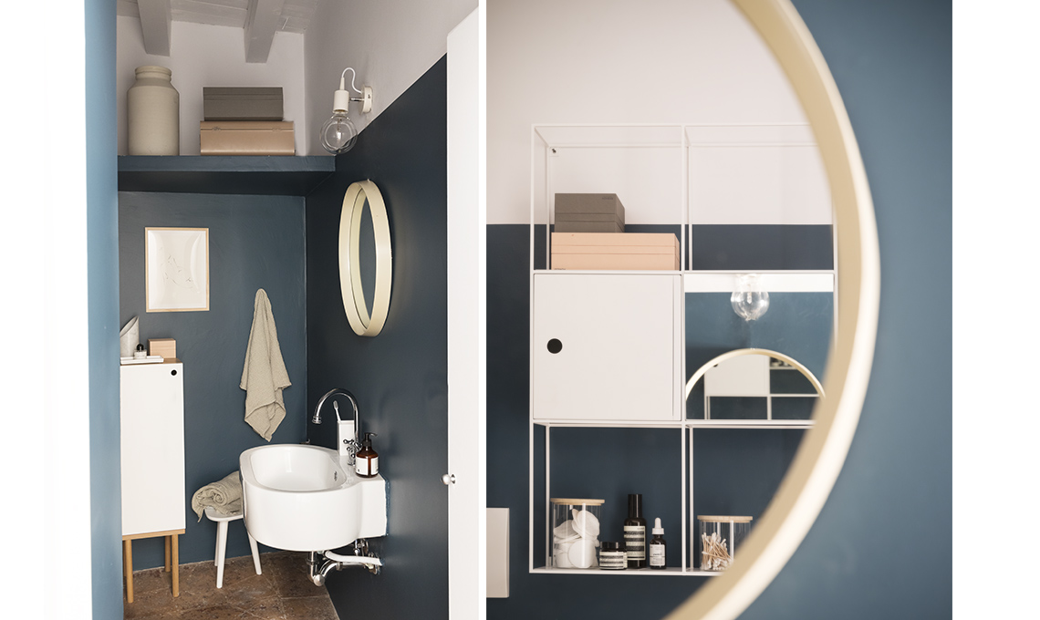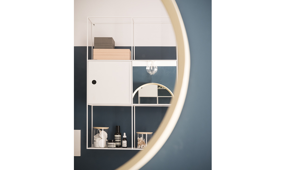 Riflessa nello specchio vintage [Galleria Mauro Bolognesi] si vede la composizione pensile Felt in metallo verniciato [Ex.T] con scatole Tray Box [Nomess] e barattolo con coperchio in legno [Zara Home].