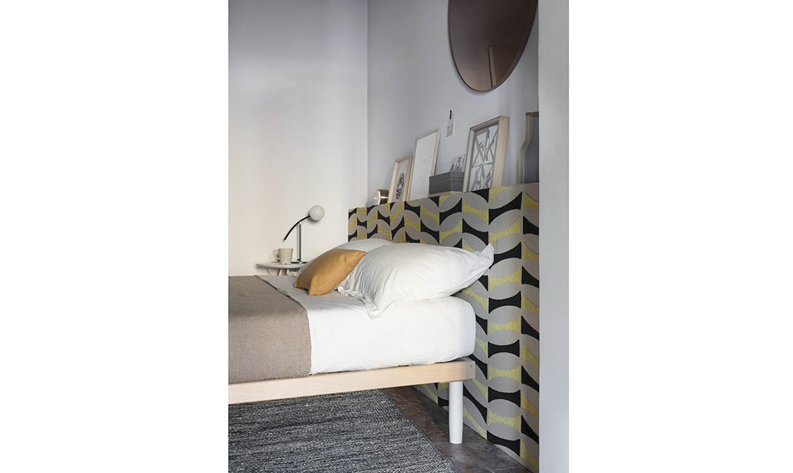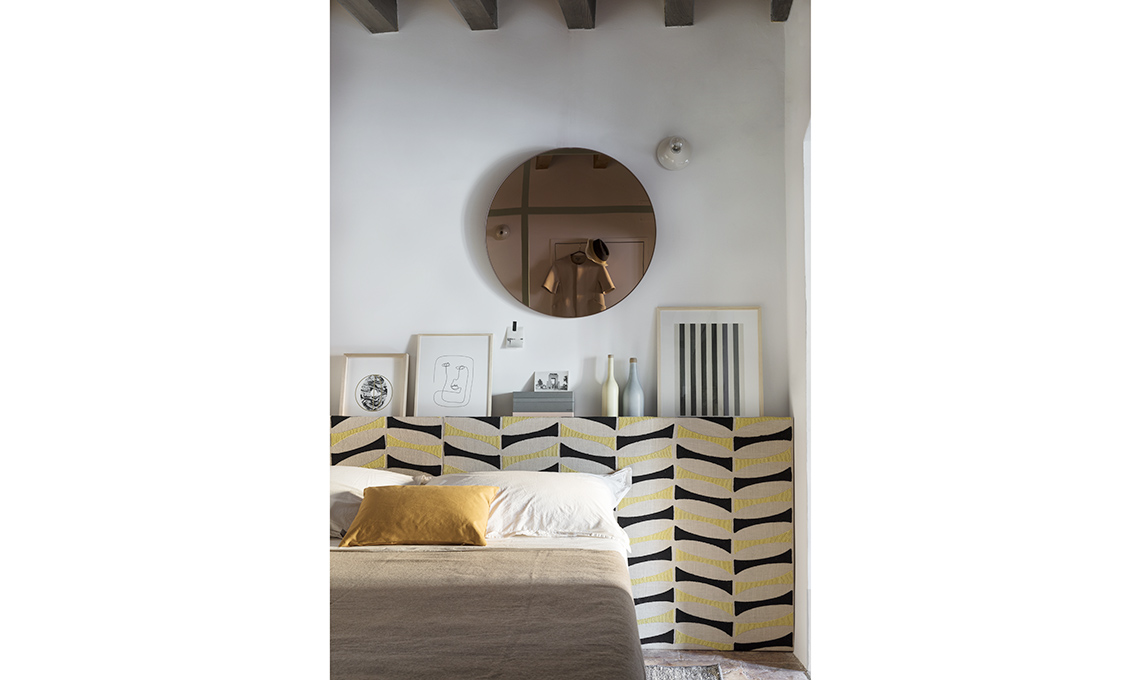 Sul sommier, copriletto [Hästens], set copripiumino [Somma] e cuscino [Aytm]. Boiserie rivestita con tessuto Pic-Nic [Dedar], stampe [The Poster Club e La Tigre], bottiglie [Ceramiche Bucci], specchio [Aytm], applique Teti [Artemide €38].