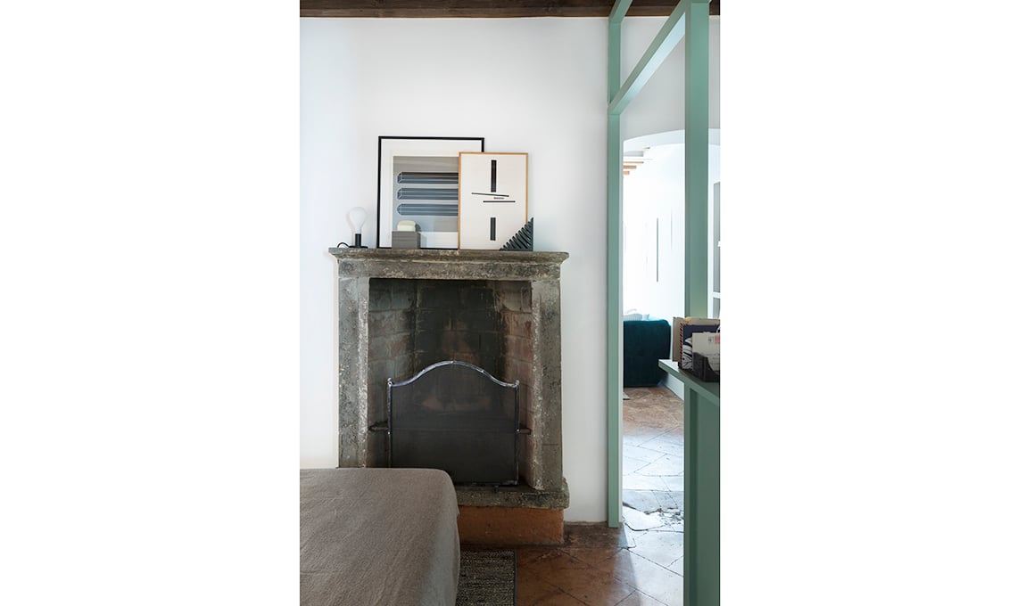Scalda l’atmosfera anche da spento il focolare che ospita sulla mensola la lampada Pom Pom [Calligaris €164] e le stampe grafiche di Gianni Colombo e Bruno Munari [da Noleggio Cose].