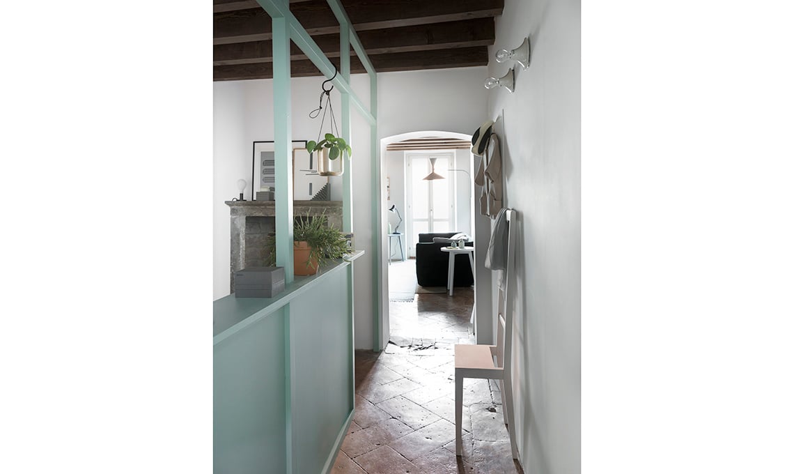 L'appartamento ha le stanze ‘in catena’, tipiche di molte case d’epoca: dalla prima, destinata alla zona notte perché più piccola e meno luminosa, entri nella seconda dove ci sono le uniche due portefinestre. Prima, non essendoci corridoio, per andare nel living bisognava passare dalla camera da letto! Ora c'è più privacy. Così la nostra stylist ha progettato un divisorio che scherma in modo light la zona notte, senza togliere la luce e creando anche un microingresso. Quanto alla cucina, aperta e proprio di fronte alla porta d’entrata, doveva essere minimale ma organizzata.