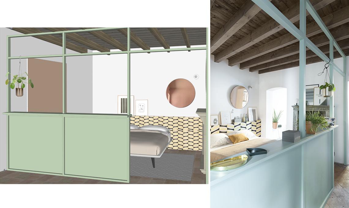 Per schermare la camera la proprietaria di casa non voleva una parete, né una soluzione vaga come un paravento. Questa struttura in legno è perfetta: stabile ma ariosa, di un colore speciale. E fa anche da piano d’appoggio!