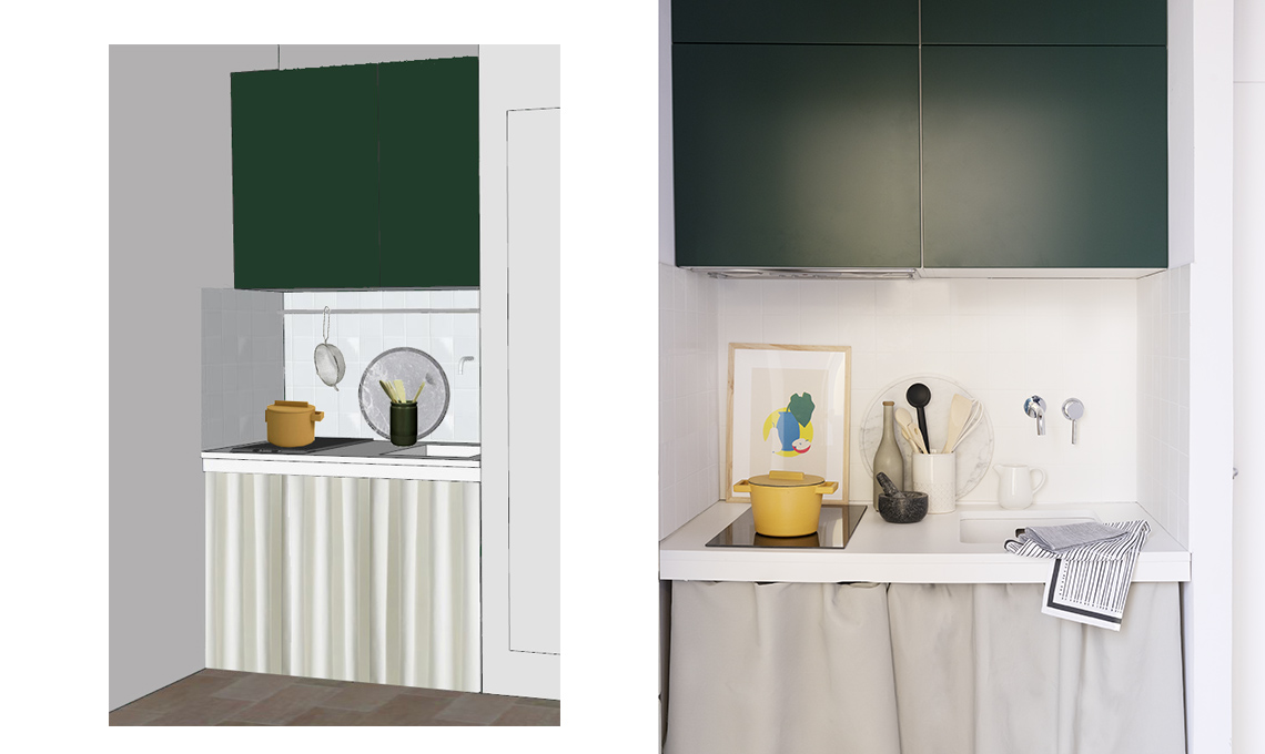 A sinistra il rendering e a destra la mini cucina: Sul piano a induzione Möjlig [Ikea €199], casseruola Terra.Cotto [Sambonet €120,90], lavello Kubus [Franke €513] con rubinetto Pan [Zucchetti €280,60]; piastrelle Sistemic Città [Marazzi] e tenda in tessuto Noriko [Nya Nordiska]. Stampa [Studio Atto], bottiglia [Ceramiche Bucci], utensili [Tescoma], sottopiatto [Scandola Marmi], strofinaccio [Vallesusa], lattiera [Ikea].