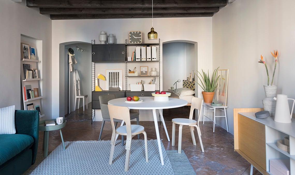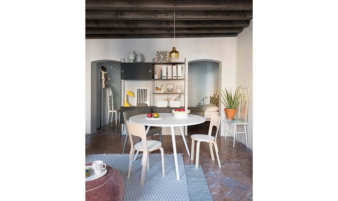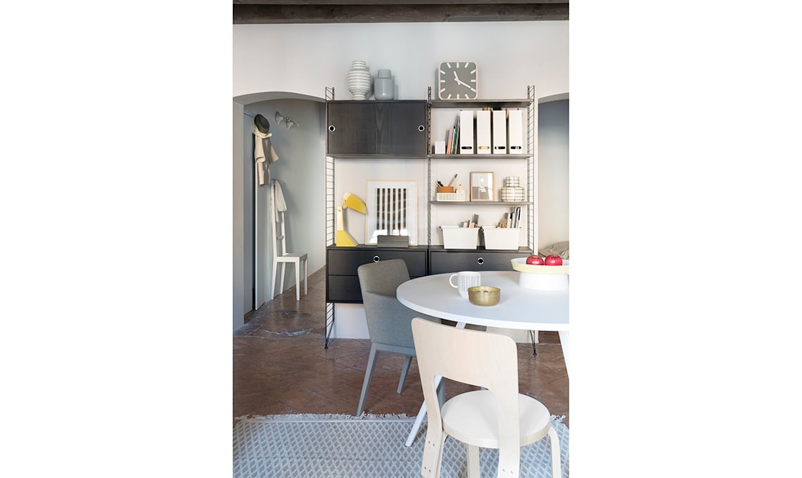 pranzare ma anche per lavorare; l’archivio trova posto sulla libreria String System [String]. Portafrutta [Tacchini], tappeti Cage [cc-tapis] e Hemp Straw [Carpet Edition]; panca Hang Tall [Ex.T].