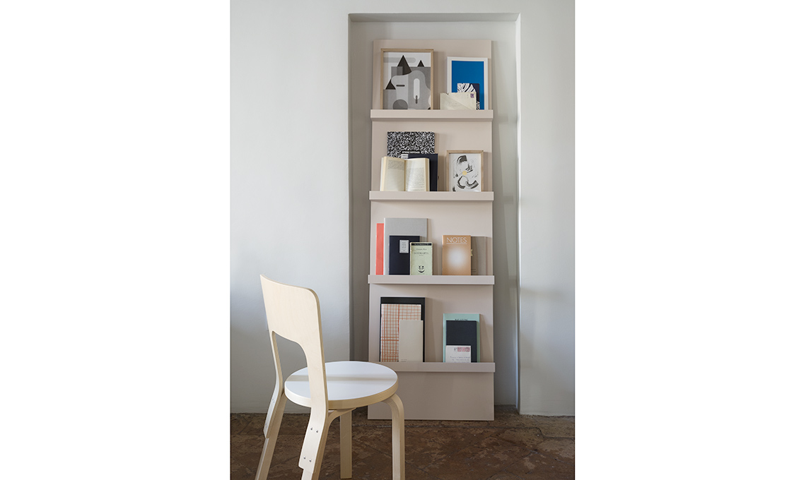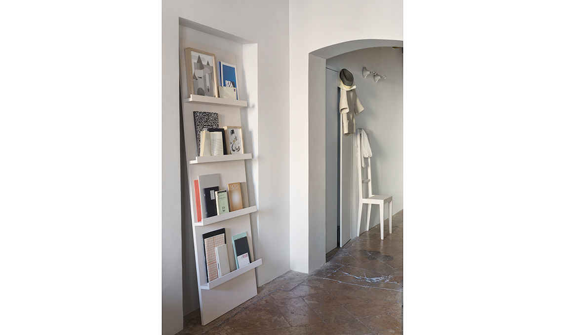 Una libreria mobile appoggiata alla nicchia per avere sott’occhio illustrazioni. Puoi realizzarla applicando a un pannello di legno le mensole reggi quadri di Ikea.