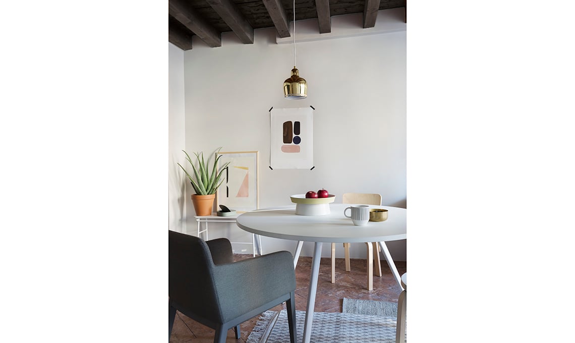 La divisione degli ambienti è stata la prima sfida da affrontare: «Gli spazi a vista richiedevano uno stile molto curato, ma anche pratico e confortevole, dato che a casa lavoro spesso» racconta la proprietaria dell'appartamento. Il giallo alle pareti non dava risalto allo splendido pavimento in cotto antico e alle travi a vista, già ‘caldi’, anzi appesantiva. Meglio il bianco sporcato da un po’ di grigio (il bianco ottico dà l’impressione di poco pensato, non rifinito). Giallo, rosa e toni verde-blu sono stati riservati a complementi e arredi: multifunzione, e da spostare al bisogno.