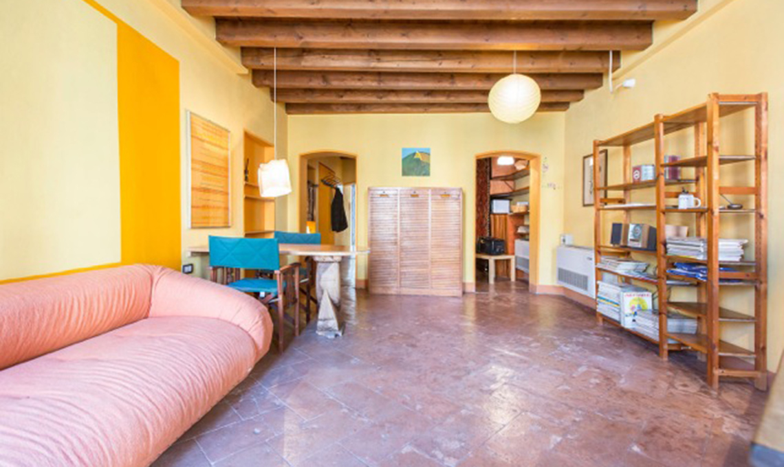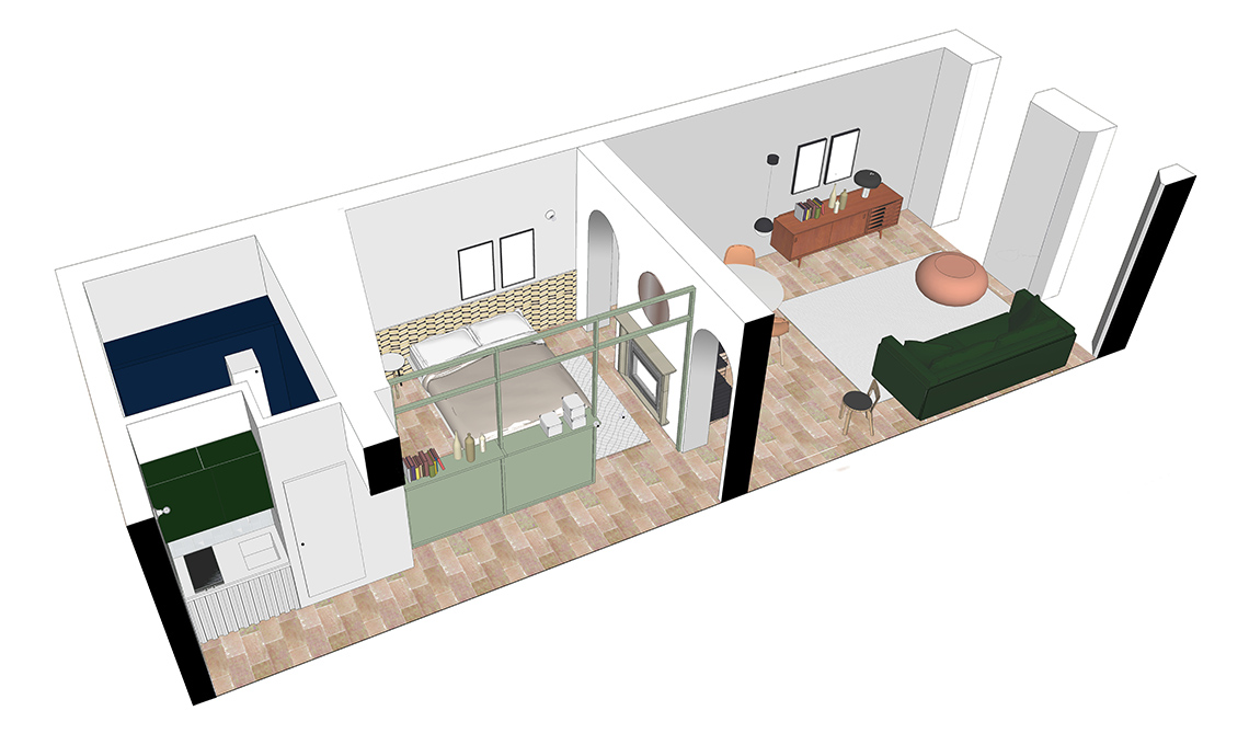 La struttura della casa d’epoca è stata mantenuta. Cucina e bagno sono di fronte alla porta d’ingresso; a seguire i due ambienti principali, in catena, in diretta successione e divisi solo dalla parete portante con i due archi: necessari perché le uniche finestre sono quelle del living. Con la creazione di un corridoio si accede ora alla zona giorno senza entrare in camera e una delle nicchie preesistenti contiene il piccolo guardaroba.