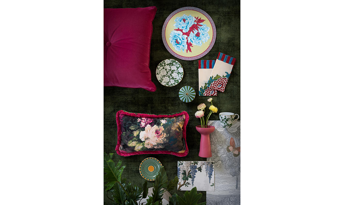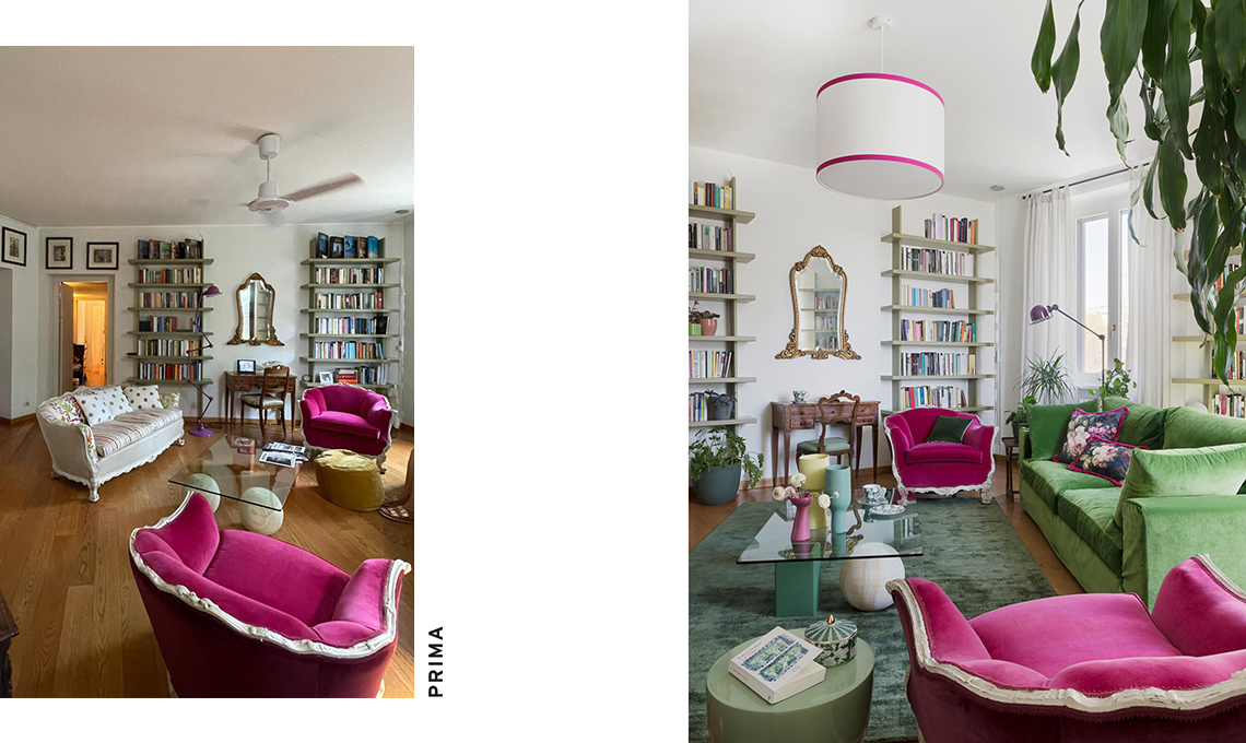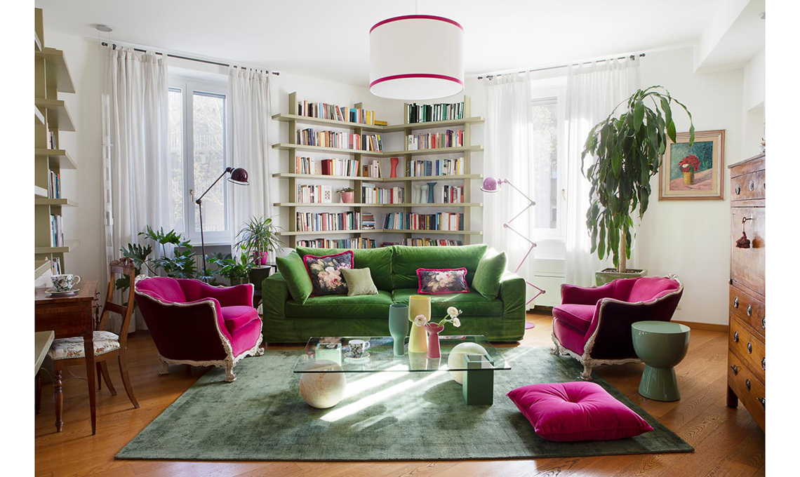 Sul divano verde, acquistato e rivestito in velluto da [Valter Pisati] come le poltrone fucsia, cuscini Ava Marika Elettrico [Woodchip & Magnolia, cm 30x50 e cm 50x50] e Carrè in velluto color verde acido [L’Opificio, cm 33x33]. Tavolino Tamtam verde oliva [Pols Potten da Nap Atelier, ø cm 35,5x46h], tappeto Riflessi Luce Green [Sirecom], sul coffee-table in vetro tazza e piattino Big Mama colore Lilium Avorio in porcellana di [La Double J] come il contenitore Goodie; vasi colorati [Laesse di Vazzoler Stefania]. A terra, cuscino Carrè ciclamino [L’Opificio, cm 60x60], lampadario in tessuto con passamaneria fucsia [Il Paralume di Mariangela], piantane Signal [Jieldé da Rossana Orlandi]. Piante [F.lli Ingegnoli] in vasi [Teraplast].