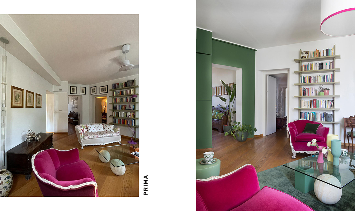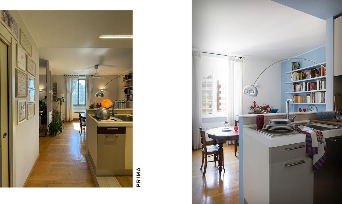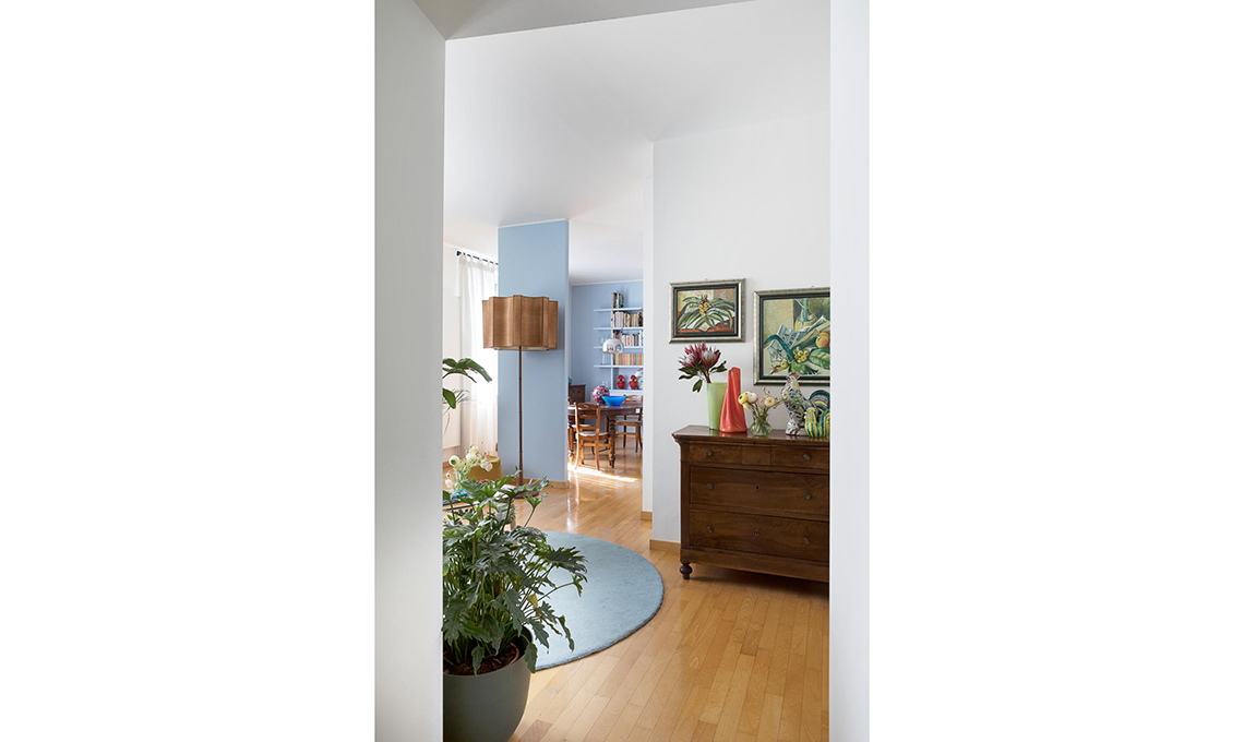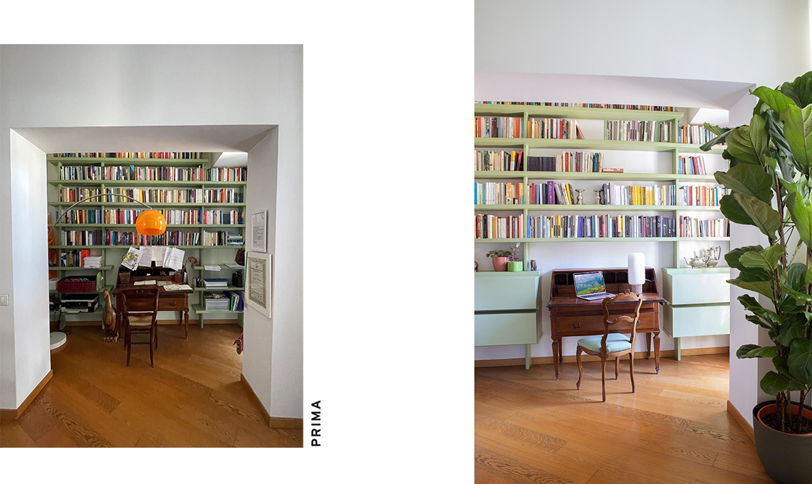 Quando l’appartamento accanto viene messo in vendita, Angela non ci pensa due volte a comprarlo per ‘allargarsi’: i mobili, gli oggetti di famiglia e i libri sono così tanti che le serve più spazio e la vecchia cucina che si affaccia sull’ingresso proprio non le piace. Così parte la ristrutturazione: il cucinotto diventa studio e all’originale trilocale si aggiungono una sala con pranzo e cucina, più una stanza e un bagno di servizio. «Ma tempo un paio d’anni mi sono resa conto che c’era ancora troppa roba...», racconta Angela, «e tanti mobili e oggetti ‘non si parlavano’, dando una sensazione di disordine. In questa casa non c’era più armonia e io avevo bisogno di aiuto per ridare un senso al tutto. Così ho chiamato Vanessa».