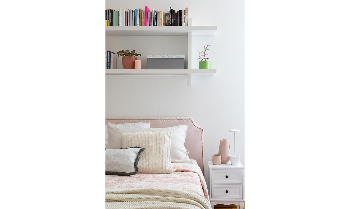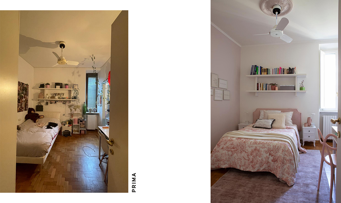 C’erano due pezzi ai quali Angela non voleva rinunciare: il letto e il comò. Per renderli parte integrante della ‘nuova’ camera, Vanessa li ha fatti ridipingere in un color glicine preso dalla tappezzeria dietro al letto.