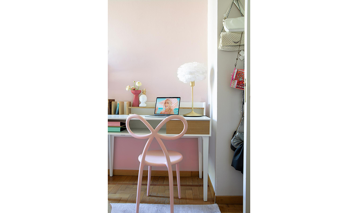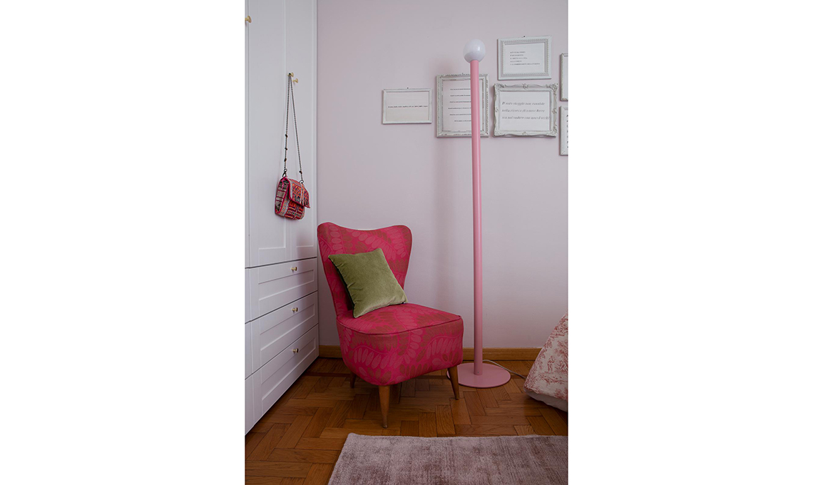La palette chiesta da Giorgia per la sua stanza partiva dal rosa cipria e l’effetto finale doveva essere un po’ rétro. Detto, fatto: una nuova testiera sagomata è completata da tessili Toile de Jouy e comodini rococò... e a fare da contraltare c’è la poltroncina fucsia!