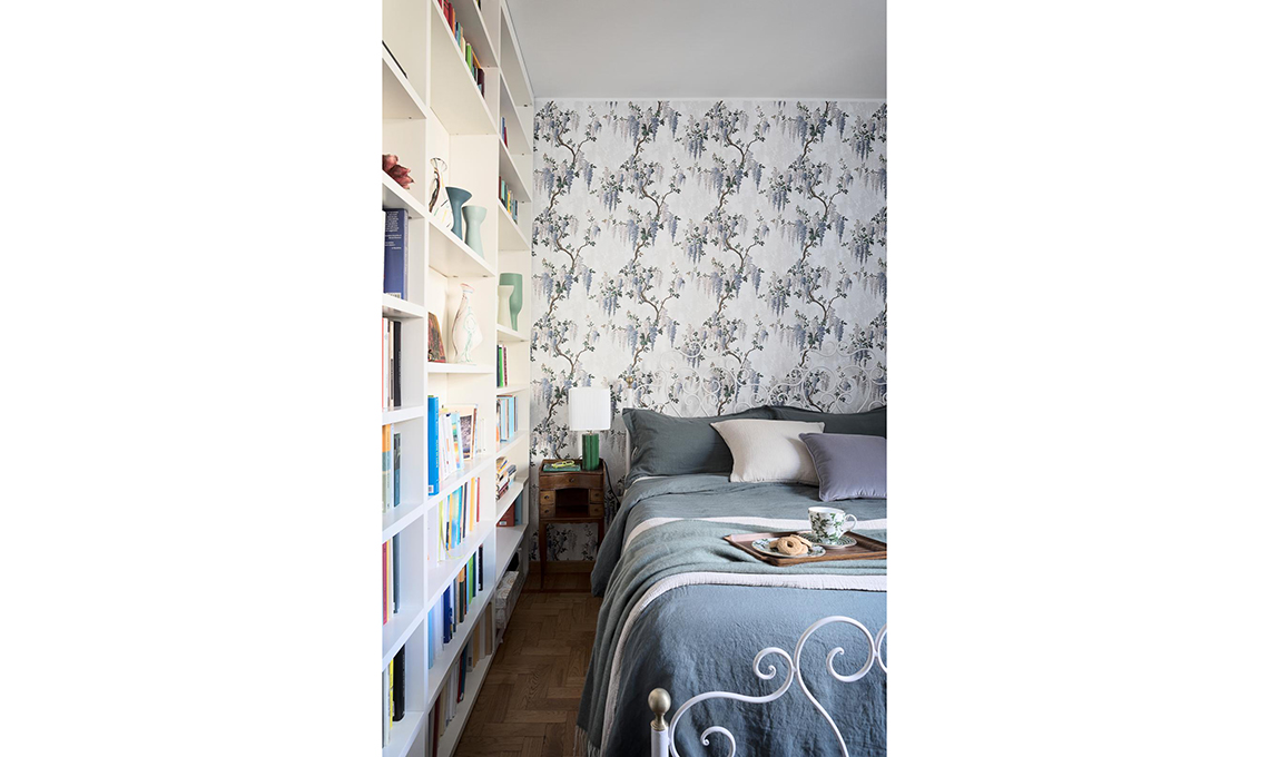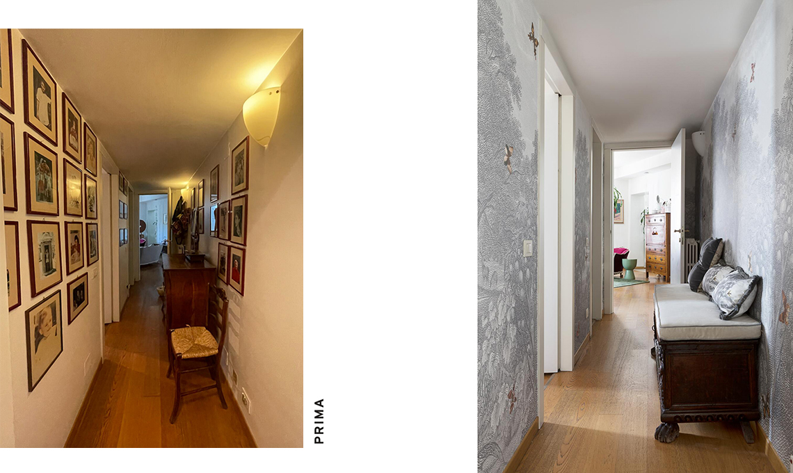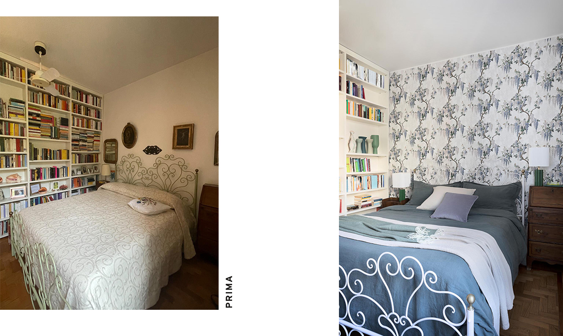 Anche qui il bianco non faceva spiccare nessun mobile: la wallpaper romantica e i mobili rieditati hanno ricreato equilibrio. E la carta da parati poetica del corridoio introduce delicatamente a questa zona intima.