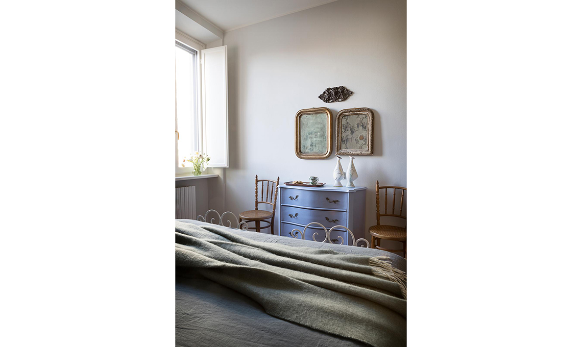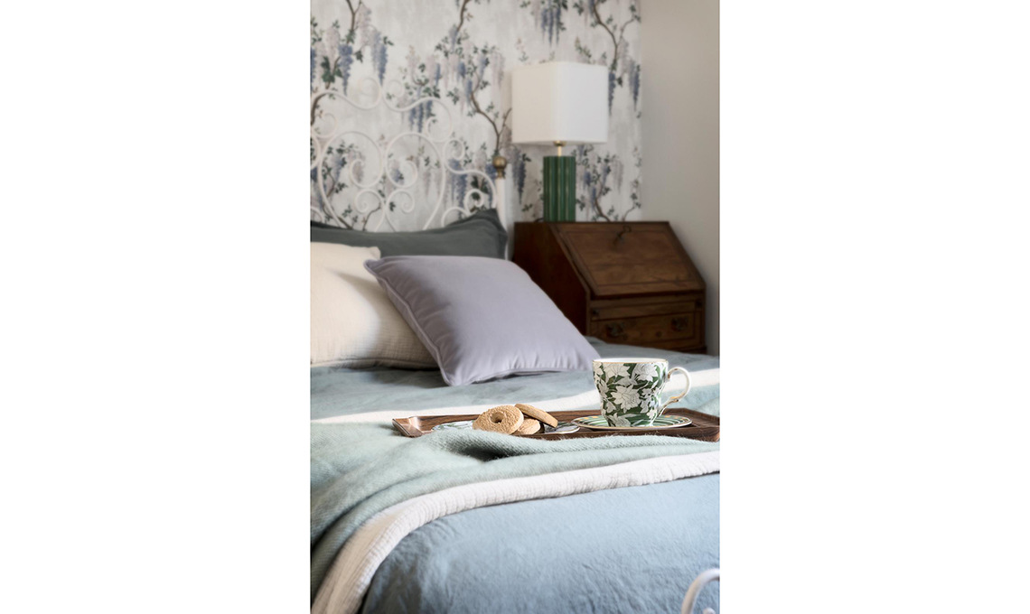 Letto con lenzuolo e federa in lino color sale marino più copriletto double face sale marino- talco di [Borgo delle Tovaglie]; cuscini [L’Opificio e Woodchip & Magnolia]. Sul comodino, tazza e caraffa [Schneid Studio] e lampada Poldina Reverso [Zafferano]. armadio Platsa [Ikea].