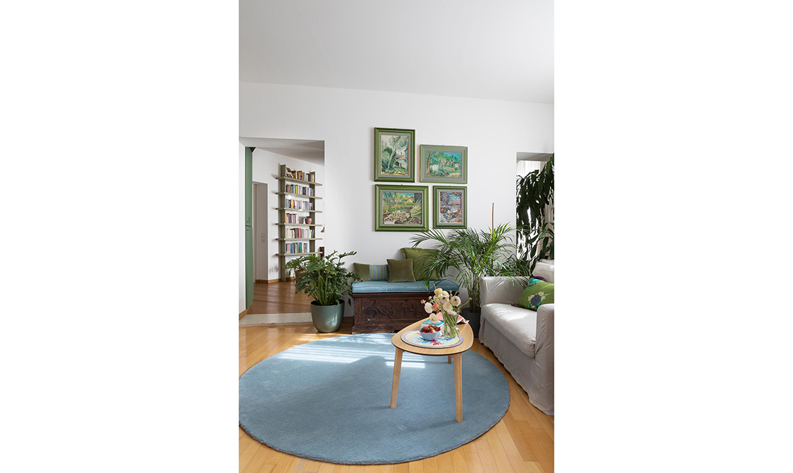 Sulla poltrona rivestita dal tappezziere [Ivano Caspani], cuscino con fodera in organza Big Dahlia verde acido [Lisa Corti, cm 35x50]; sulla cassapanca d’epoca con cuscinatura di seduta di [Ivano Caspani], cuscino Carrè in velluto verde acido e Degradè in cotone [L’Opificio, cm 33x33 e cm 25x60]. Sul tappeto rotondo Bent azzurro [Benuta, ø cm 150], tavolini Artik [Miliboo] con tovaglietta Blue Garden Chutney [Lisa Corti] e ciotola Onda [Laesse].