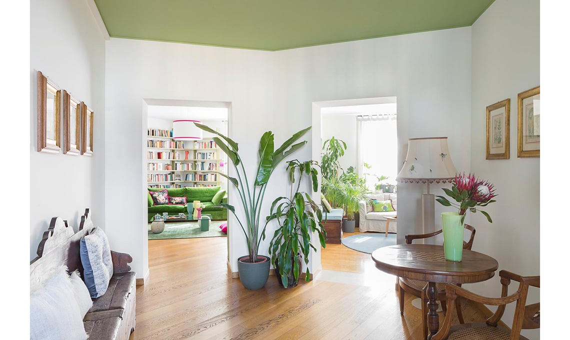 è collegato attraverso due aperture squadrate: qui il verde in una nuance chiara è stato posato sul soffitto, per riproporzionare l’ambiente; il punto di colore è stato preso dalla libreria dello studio,