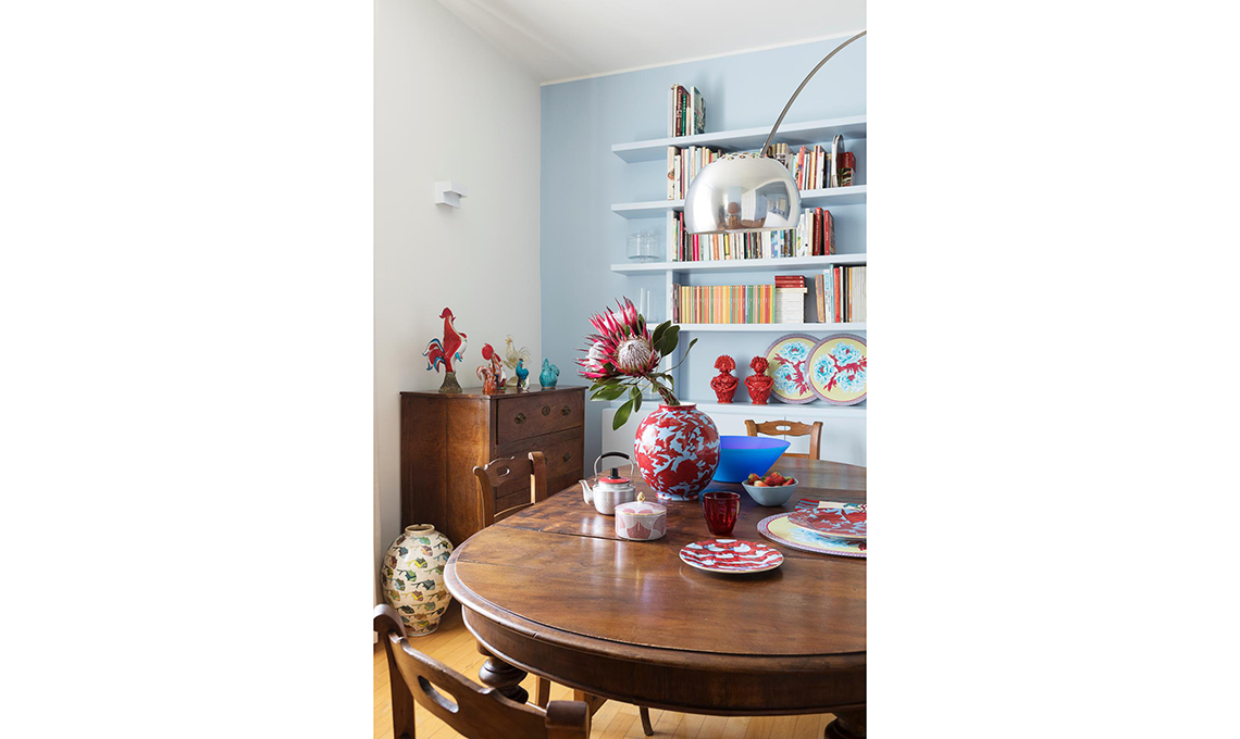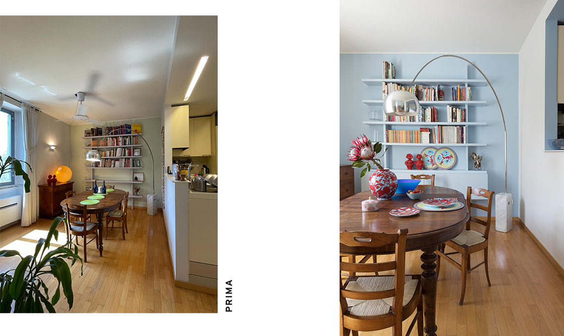 e io adesso ne sono innamorata!». Qui il colore tenue serve per dare volume allo spazio. Hai notato che anche la libreria è stata dipinta nello stesso colore? Questa scelta serve a dare importanza al tavolo di famiglia e alla lampada ad arco, icona del design.