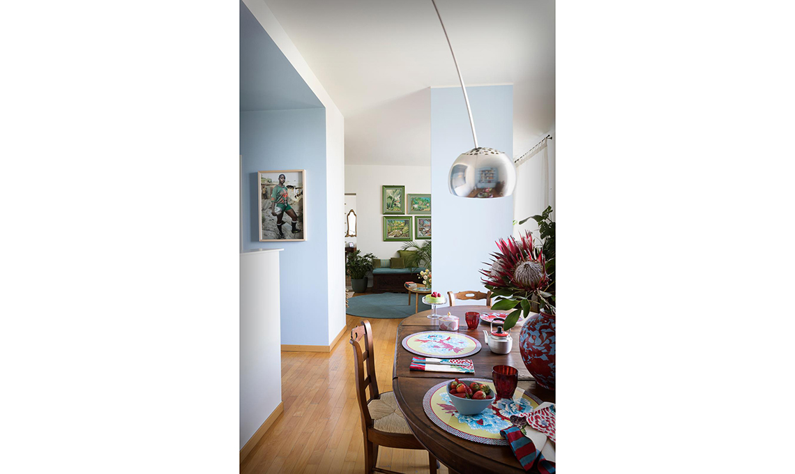 «Il primo passo è stato capire cosa tenere e cosa regalare o riportare a casa dei genitori» spiega Vanessa. «E per accordare gli arredi abbiamo giocato con una palette di colori fresca e con tappezzerie poetiche. Così il ‘caos’ è sparito! Son partita dal verde delle numerose piante della casa per definire ingresso e soggiorno, nel quale ho aggiunto tocchi di energia in fucsia; nel salottino e nella sala da pranzo/ cucina ho proposto un azzurro che ricorda i cieli di primavera. Così l’insieme è più fresco e i mobili di famiglia tornano protagonisti».