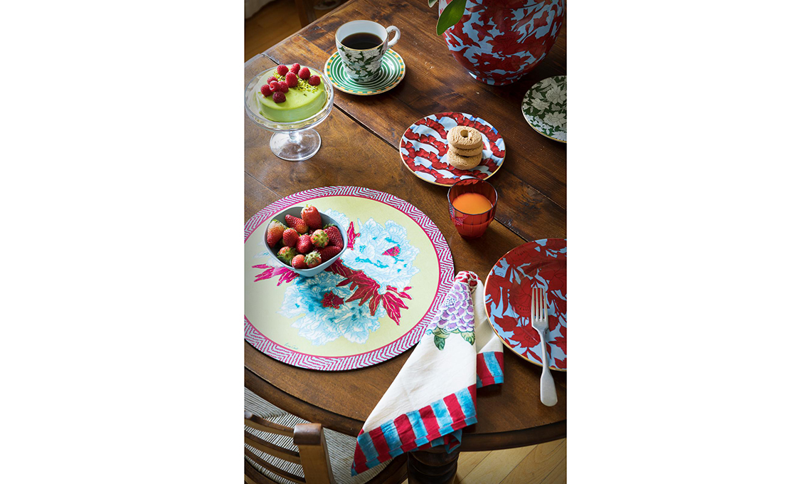 d’epoca, tovaglietta tonda rigida Blue Garden Chutney e tovagliolo Arabesque Corolla Natural Coffee [Lisa Corti], ciotola Onda azzurra [Laesse], vaso Big Bubble,