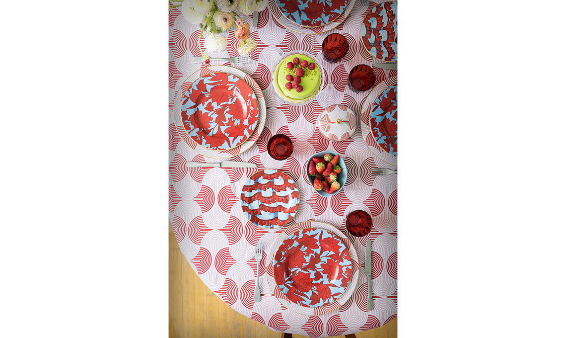Tovaglia Medium Slinky rosso in lino, sottopiatto Slinky, piatti Roman Holiday e Roman Liberance