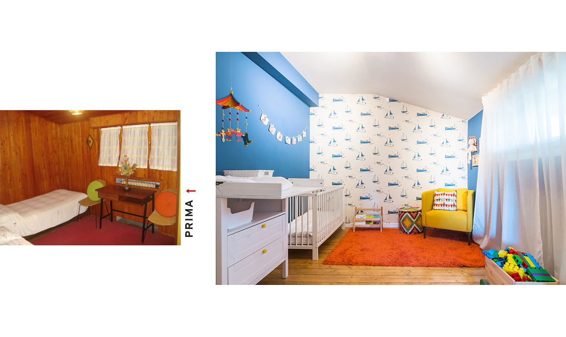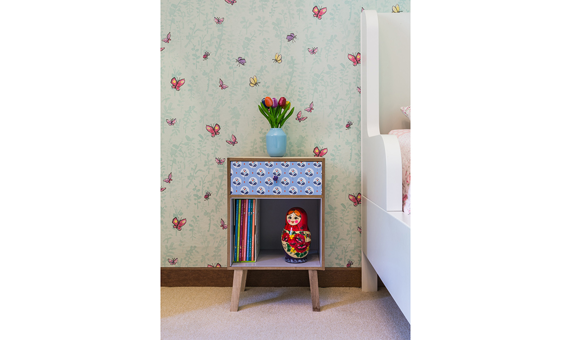 due spazi ‘su misura’ per i figli. Qui: wallpaper All About Me coll. Sail Away [Harlequin], letto, fasciatoio e sedia [Ikea], pittura Drawing Room Blue [Farrow & Ball].