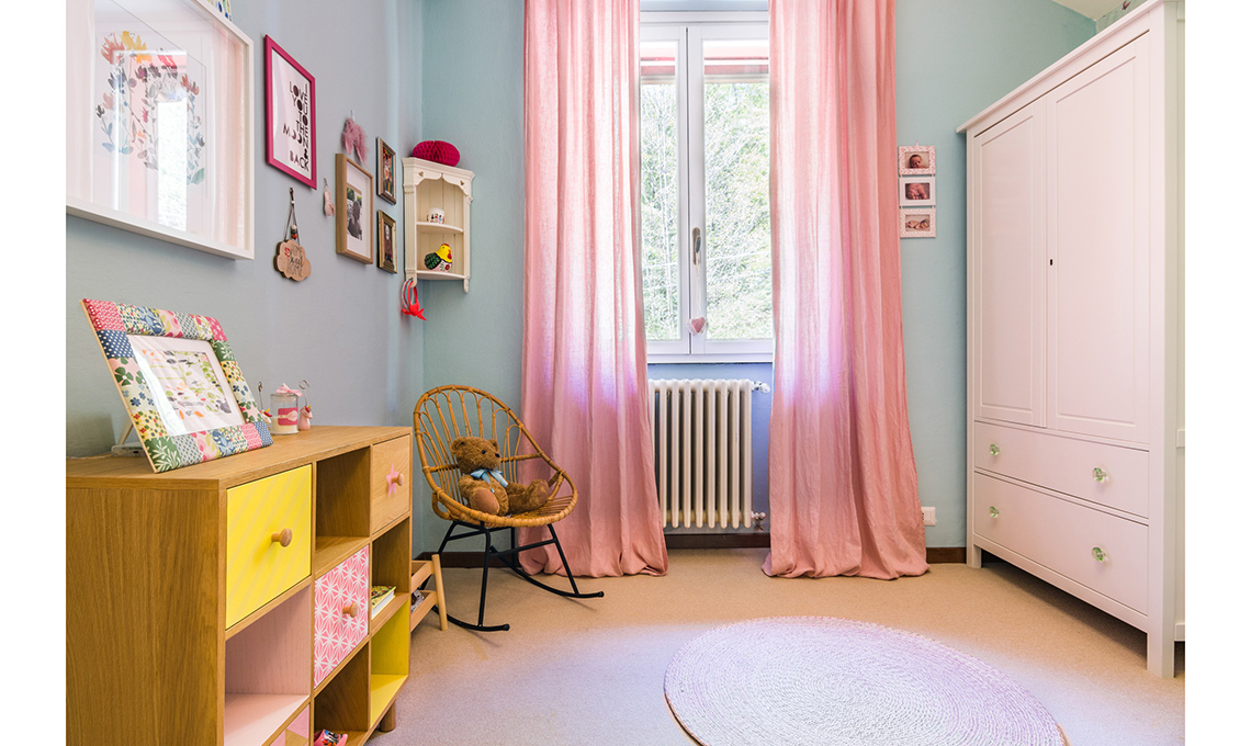 Anche la cassettiera è personalizzata e riprende i colori della cameretta. Pittura opaca Cape Town Blue [Fleur], tende [Ikea], dondolo Petunia [Maisons du Monde € 99,99].